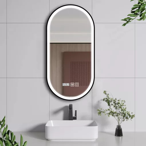 HD Dallas 50 cm széles fali ovális LED okostükör ambient világítással, érintőkapcsolóval, digitális órával és páramentesítő funkcióval